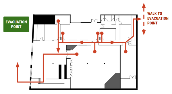 “The fire alarm has sounded. We are going to evacuate through the nearest fire exit and meet at the Emergency Evacuation Point on King Street.