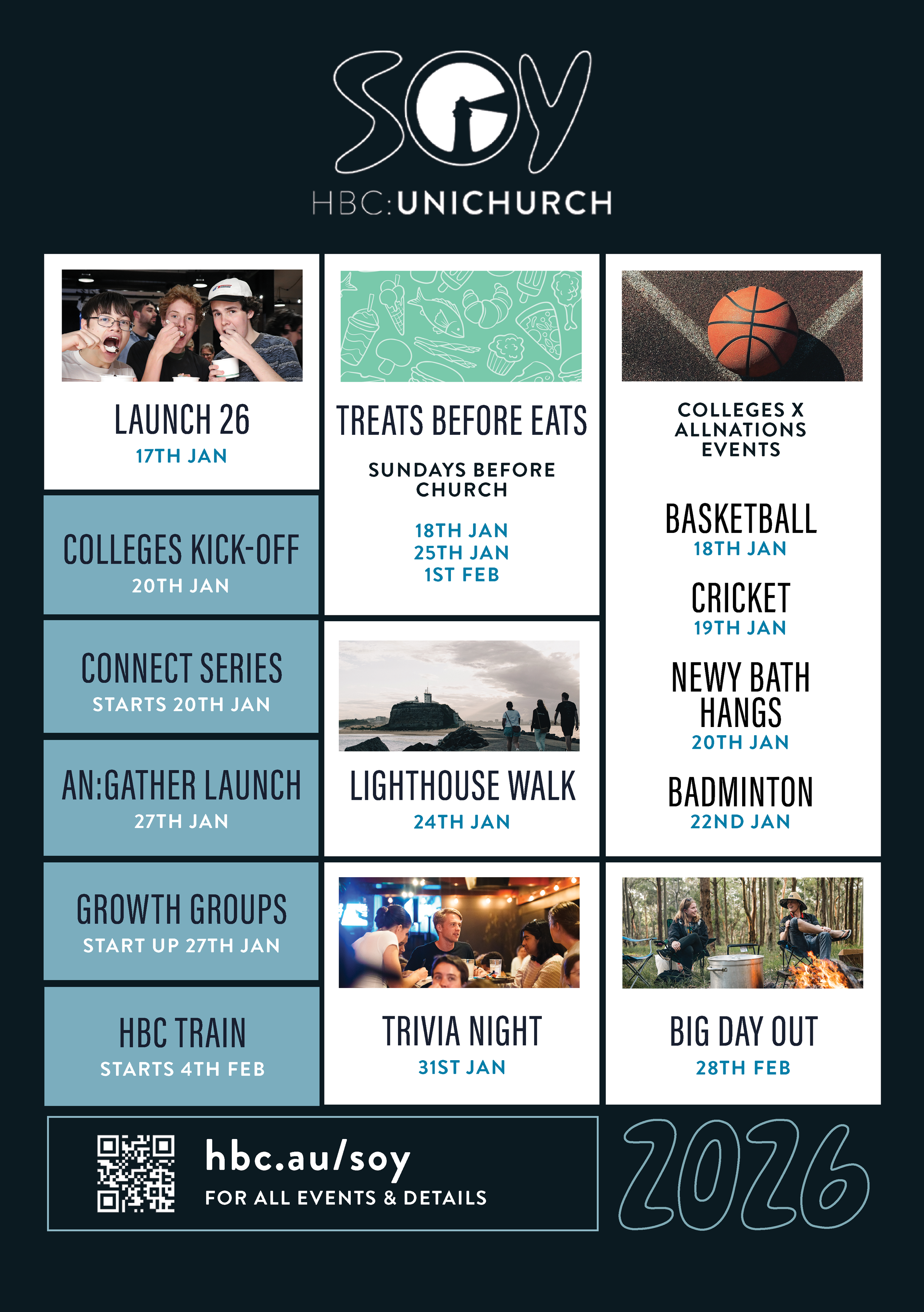 Come join us as we launch into the new year together by lifting our eyes to what God wants for Unichurch and how we can be involved in bringing the incredible news of Jesus to the campus.